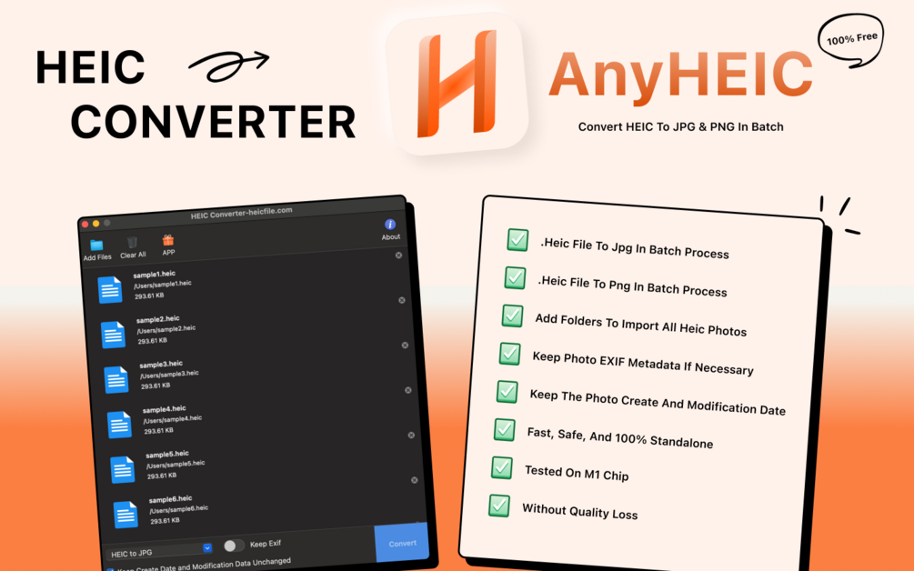 AnyHEIC is a powerful tool for converting HEIC to JPG and PNG formats. It's 100% free and compatible with all macOS systems, including those with M1/M2/M3 chips. Batch processing allows you to convert hundreds of HEIC images to JPG and PNG simultaneously.